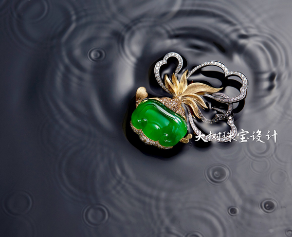 如意为头,牡丹花尾,精美绝伦的虎头金鱼,在抽象和写实之间娴熟变幻。从如意翡翠到美轮美奂的金鱼,值得点赞创意设计!